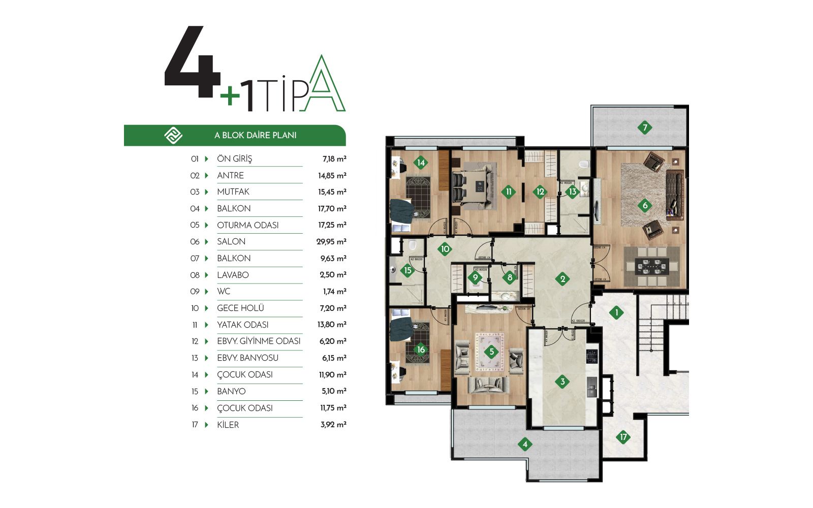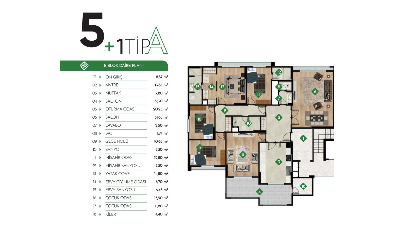 8500 m² arsa, 6500 m² yeşil alan, kamelyalar, çocuk parkları, spor alanları ve güvenlikli site girişiyle keyifli bir yaşam alanı sunuyor. Proje; 40 adet 4+1 ve 10 adet 5+1 daireden oluşuyor.