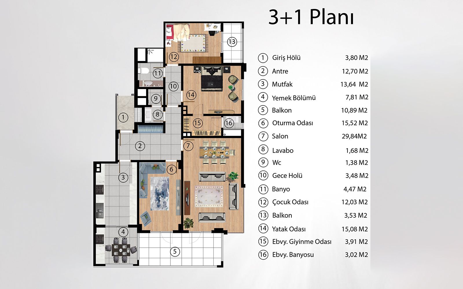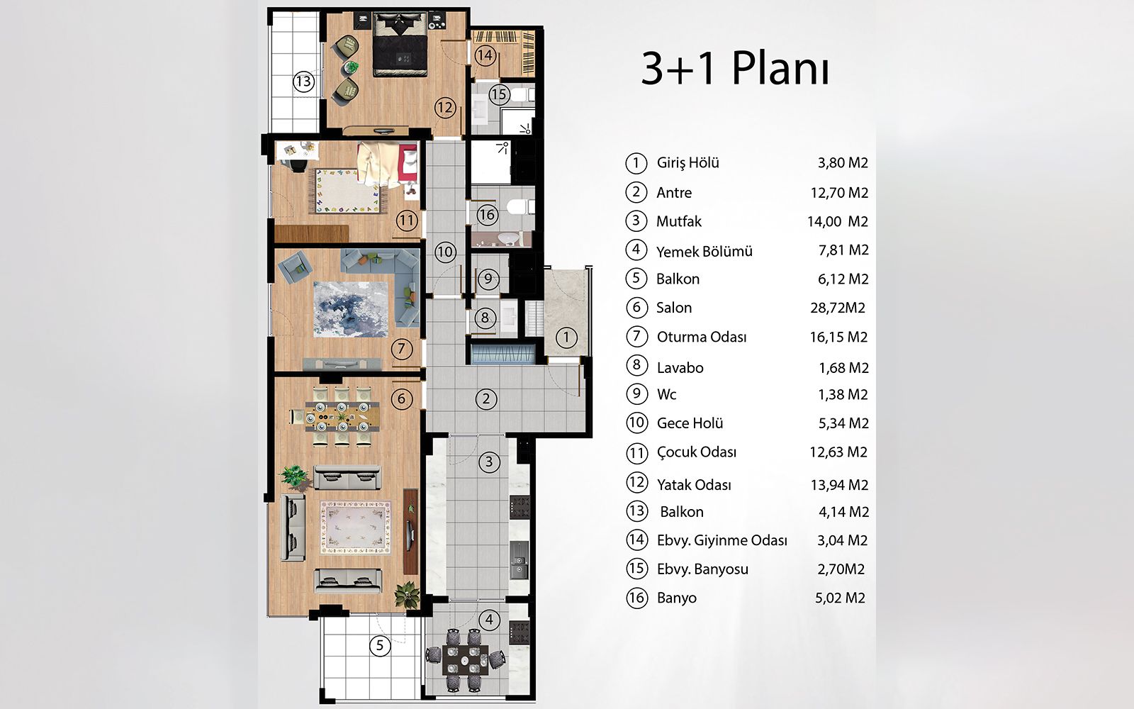 Toplam 72 daire ve 12 dükkandan oluşan proje; 3+1 ve 4+1 daire seçenekleriyle geniş ve konforlu yaşam alanları sunuyor. Her daireye özel kapalı otopark, projeye ek bir ayrıcalık katıyor.